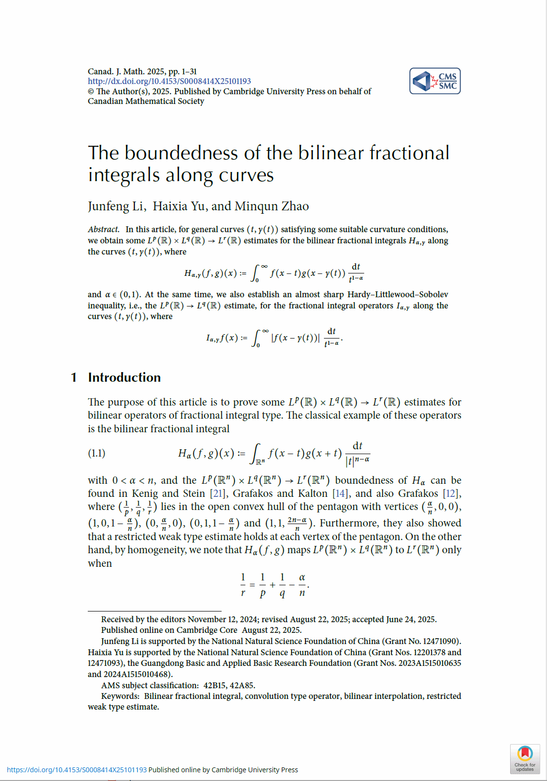 双线性算子的(p,q,r)有界性是调和分析中重要且有一定难度的课题,在调和分析以及其他数学研究方向中具有重要的应用。近期,数学系2025届硕士研究生赵敏群与其导师于海峡副教授和大连理工大学李俊峰教授合作在国际知名数学综合性学术期刊《Canad. J. Math.》在线发表学术论文“The boundedness of the bilinear fractional integrals along curves”。该项工作对一类曲线(特别地,它包含没有一次项的多项式)建立了沿曲线的双线性分数次积分算子的一些(p,q,r)有界性。该项工作基于对算子的限制弱型估计和一些端点情形的弱型估计,并与调和分析中著名的双线性Hilbert变换的(p,q,r)有界性问题具有密切的联系。