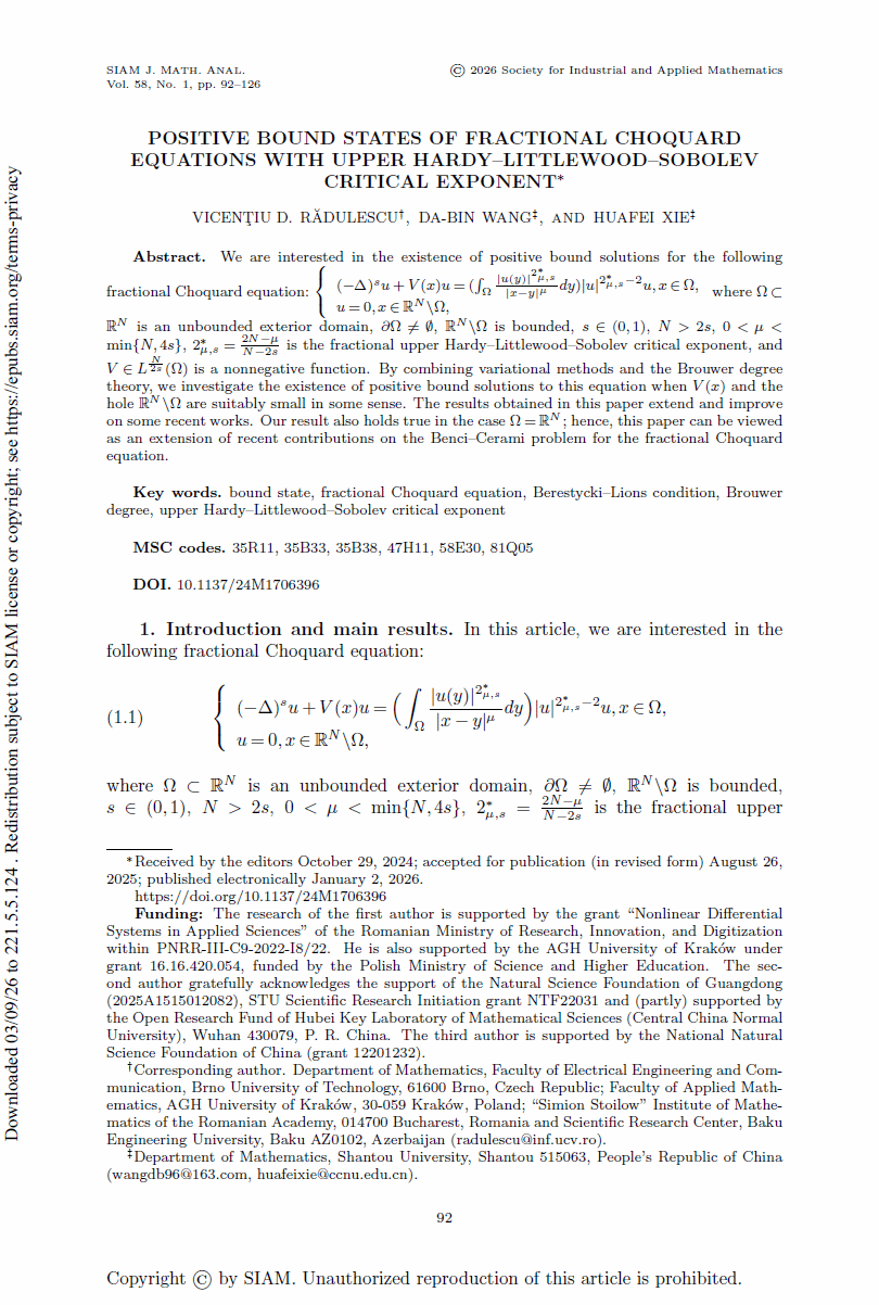 近日,我系王大斌教授、谢华飞副教授及其合作者在非线性泛函分析领域取得重要研究进展,研究成果“Positive bound states of fractional Choquard equations with upper Hardy–Littlewood–Sobolev critical exponent”发表在国际著名数学期刊《SIAM Journal on Mathematical Analysis》,论文链接:https://epubs.siam.org/doi/10.1137/24M1706396。
